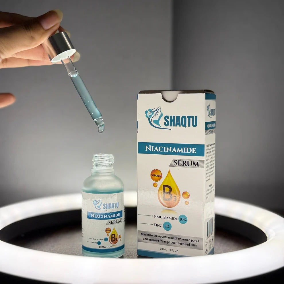 Shaqtu Niacinamide B3 Serum (10% Niacinamide + 1% Zinc) is a lightweight, fast-absorbing formula that targets multiple skin concerns to deliver visible results. Powered by Niacinamide (Vitamin B3), it helps minimize enlarged pores, regulate excess oil, reduce acne breakouts, and fade dark spots and scars for a more even skin tone. The added Zinc soothes redness, calms irritation, and supports clear, healthy skin, while also strengthening the skin’s natural barrier to protect against environmental damage.
